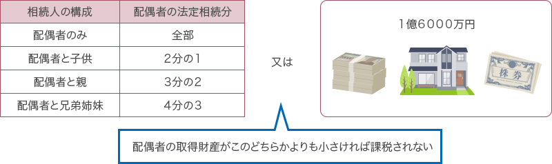 次に配偶者の税額軽減について解説します。配偶者の税額軽減とは、被相続人の配偶者が遺産分割や遺贈により実際に取得した正味の遺産額が、「1億6000万円」か「配偶者の法定相続分相当額」のどちらか多い金額までは配偶者に相続税はかからないという制度です。