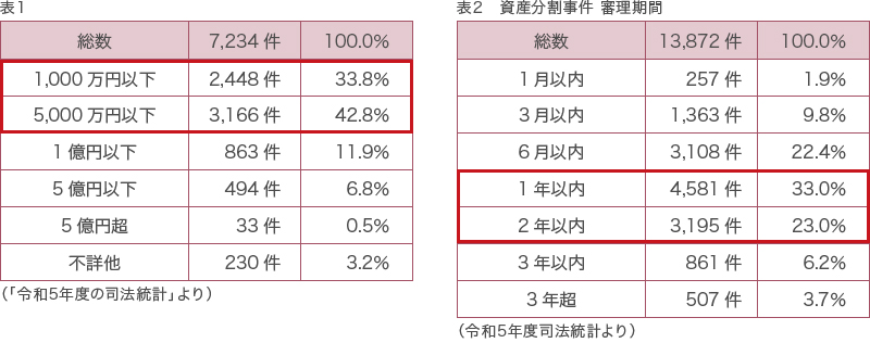 「争族」はテレビドラマや小説で取り上げられるようなお金持ちに限ったことではありません。表1をご覧下さい。この表は遺産分割事件(新受件数は13,872件)のうち認容・調停が成立した件数を遺産価額別にまとめたものです。遺産が5,000万円以下の相続が全体の4分の3を占めています。決してお金持ちだけのお話でなく、普通の家庭で起きていることが分かります。また、表2は審理期間を示したものですが、審理期間も1年以内が33.0%、2年以が23.0%と、年単位での時間がかかっています。もめると時間がかかるのです。