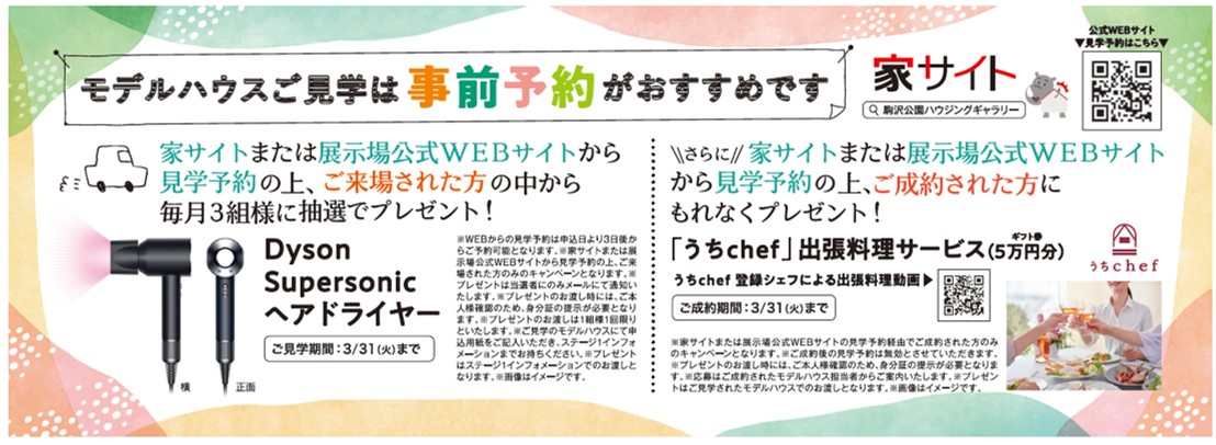 家サイトまたは展示場公式WEBから見学予約の上、ご来場された方の中から毎月3組様に抽選で「Dyson super sonic ヘアドライヤー」をプレゼント!