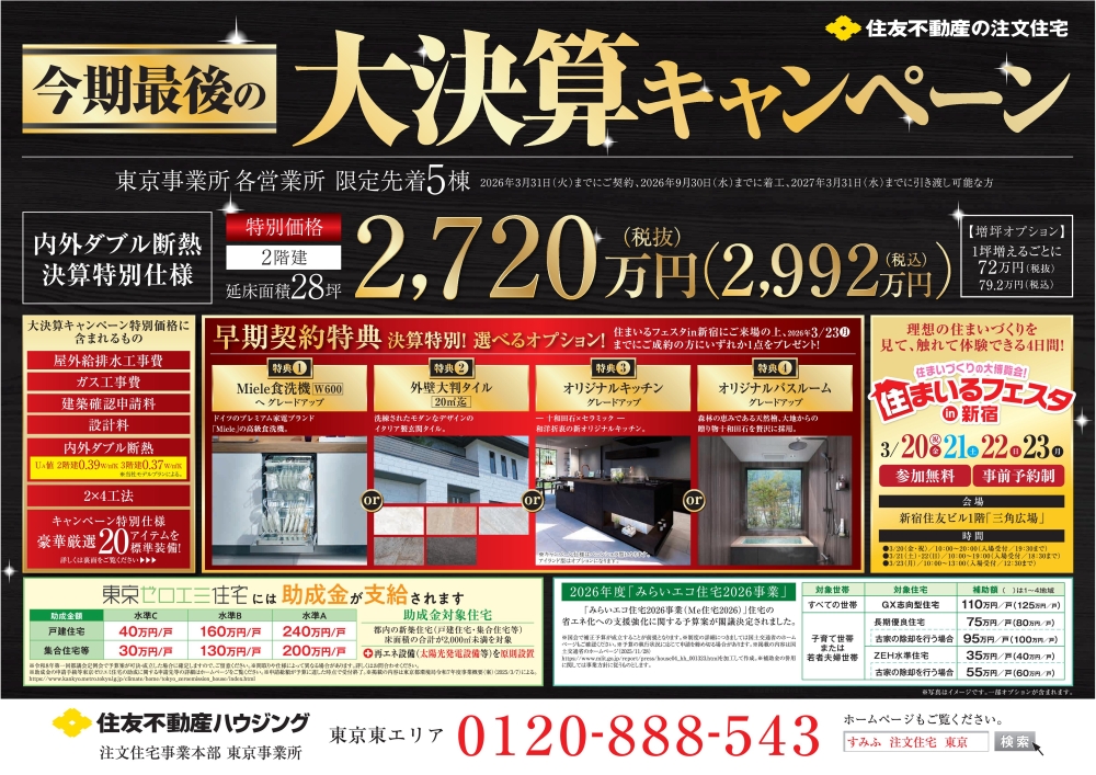 また、3/20(金)~23(月)に開催される住まいるフェスタin新宿にご来場の上、2026年3月23日(月)までにご成約の方には、早期契約特典として Miele食洗機W600 へのグレードアップ、外壁大判タイル(20㎡まで)、オリジナルキッチン グレードアップ、オリジナルバスルーム グレードアップ、のいずれかをプレゼントいたします!